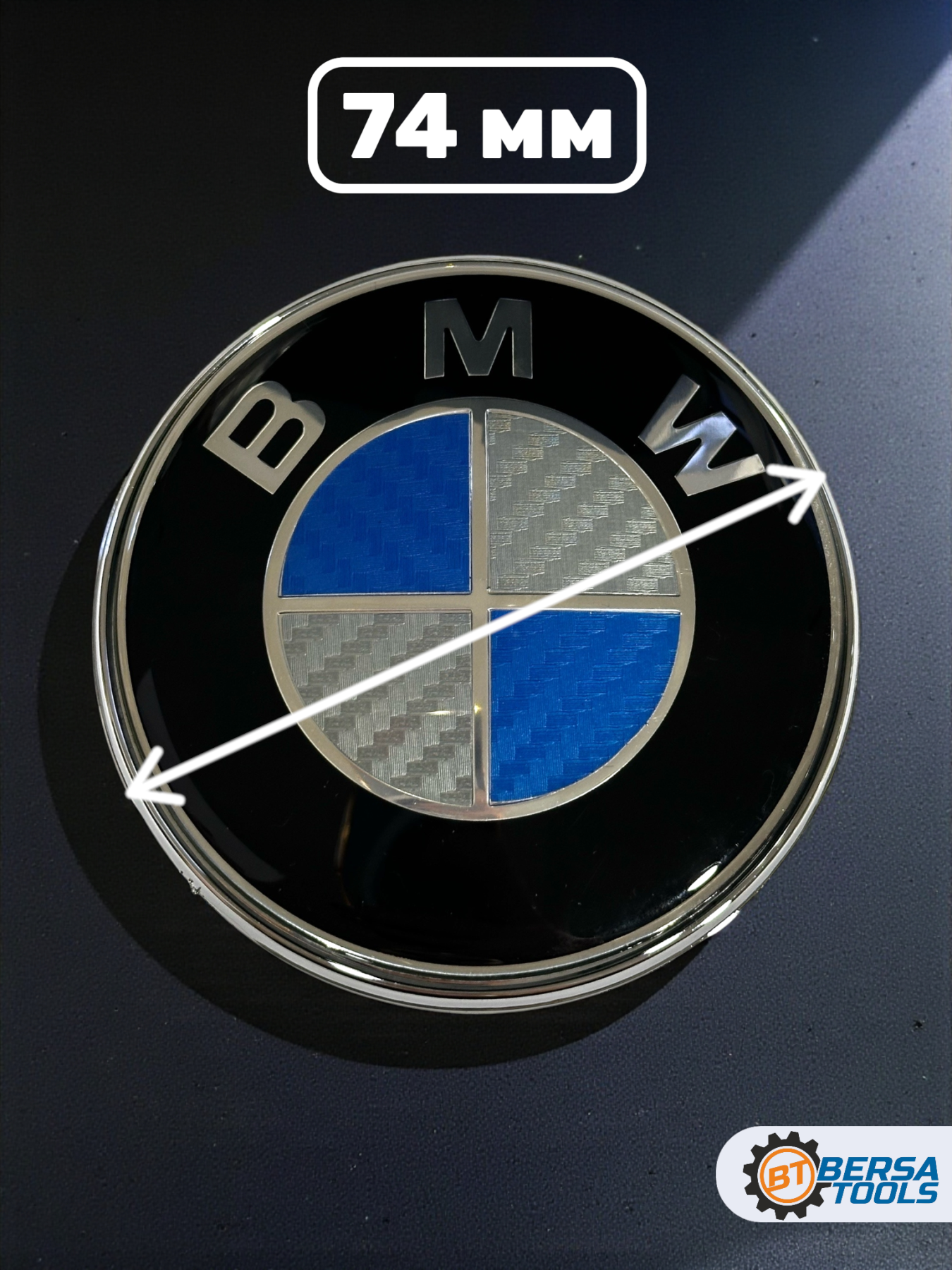 Черная эмблема BMW диаметром 74 мм с оригинальным номером - 51148203864, выполненная в эксклюзивном дизайне с текстурой карбона и стильным сочетанием синих и серебристых элементов. Модель идеально подходит для ценителей технологичного и спортивного стиля.