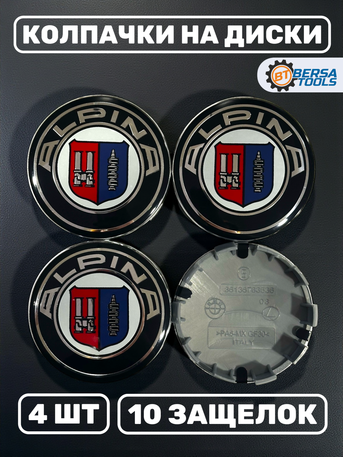 Центральные колпачки для дисков BMW, стилизованные под легендарный тюнинг-ателье Alpina. Диаметр колпачков — 68 мм, крепление осуществляется с помощью 10 усиленных защелок для надёжной фиксации на штампованных или легкосплавных дисках.