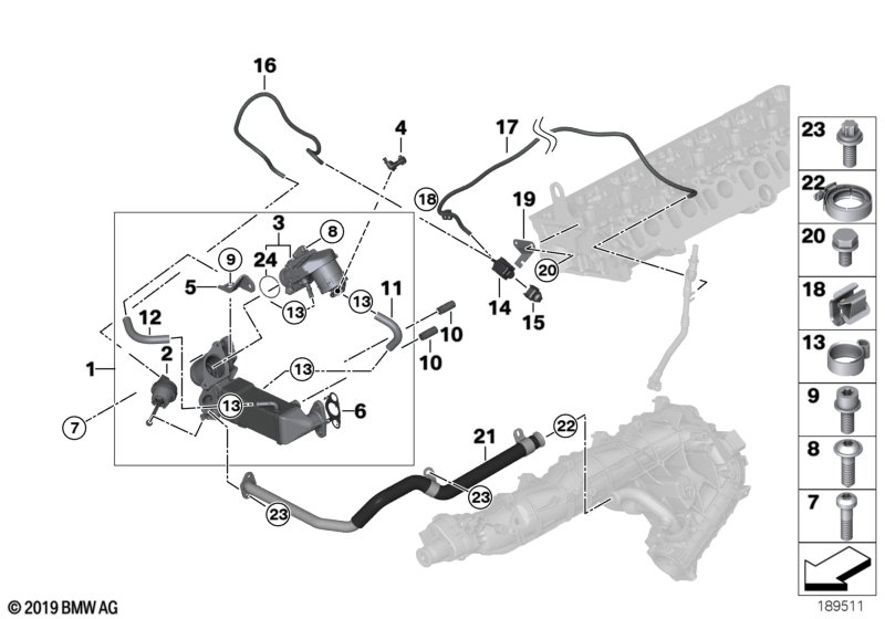 Вариант с коллектором 11618511363 (номер 1 на картинке) и охладителем (номер 6 на картинке).