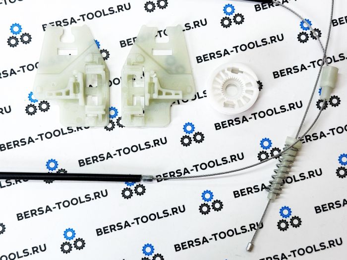 Ремкомплект применяется при ремонте стеклоподъемника в случае поломки кареток - направляющих держателей, истирания ролика или обрыва тросов.